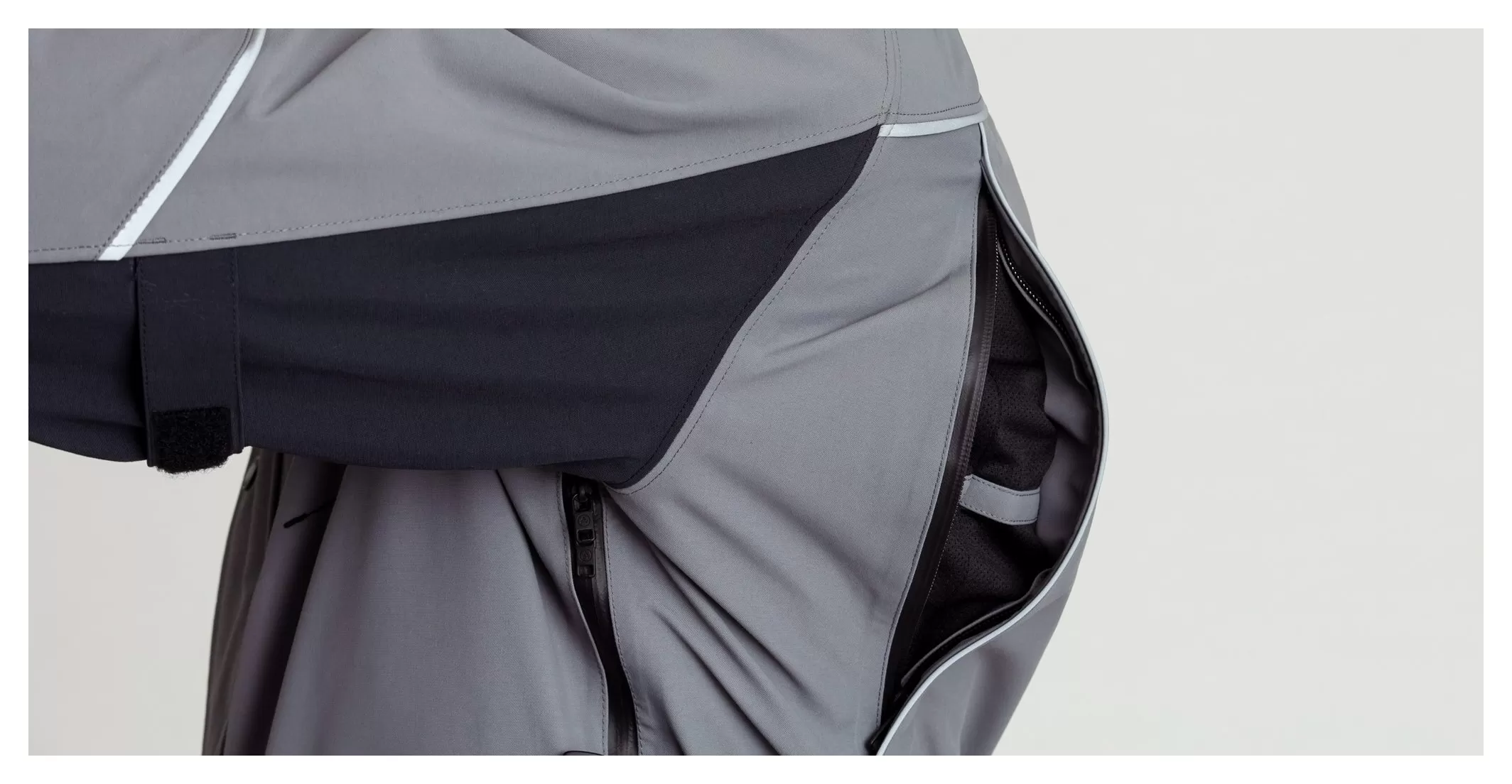 - Jacket-to-pant connection zipper at interior back