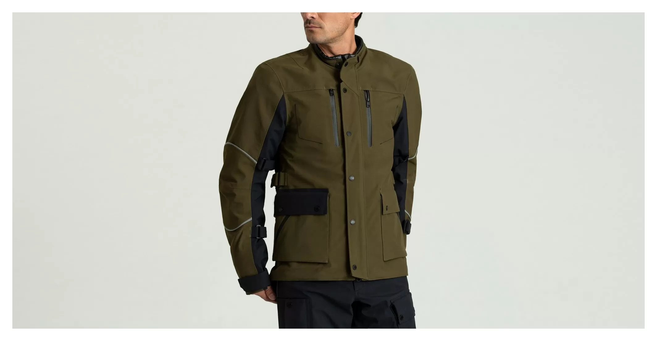 A two-way front zipper on the Divide Jacket allows the wearer to adjust the bottom hem while seated. In an effort to think of everything, branded snaps with thumb loops on the front placket enable the rider to easily close the jacket with one hand, gloves on or not. In case you encounter a rainstorm, the jacket features an interior gaiter at the neck that can be cinched down to prevent water from getting in. There is also lamb-leather detailing at the neck opening for additional comfort. The Divide Motorcycle Jacket also features plenty of storage options, including chest, hand, and patch pockets with weatherproof zippers, as well as an interior zippered pocket. The Divide Jacket is equipped with pads featuring D3O technology at the chest, elbow, shoulder, and back, all of which are CE-certified and completely removable. For maximum comfort, the elbow pockets are adjustable. Adjustable VELCRO® brand tabs at the bicep, forearm, and waist allow the jacket to be cinched down for a slim fit or loosened when cold temps call for extra layers. Additionally, VELCRO® cuffs can be adjusted to accommodate gloves, and a wind-cuff detail at the sleeve opening helps keep the elements out. Finally, a cinch at the bottom opening of the jacket allows the rider to customize the fit. Designed in tandem with the Divide Motorcycle Pant, a zipper attachment allows the two pieces to be worn together as a full body suit.
