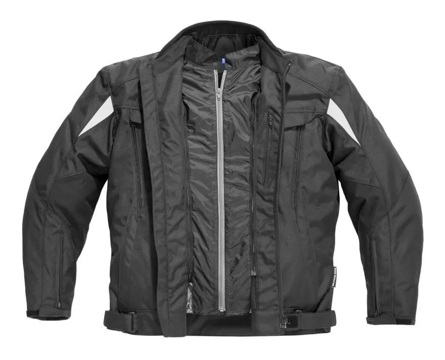 The waterproof Essential Jacket from BMW pairs a tough, water resistant shell with a fully waterproof removable zippered membrane. In warm weather, remove the waterproof liner and enjoy the high volume of airflow moving in through the roll-down front air panels and out through rear exhaust vents. In cooler conditions, the waterproof liner doubles as a windproof barrier to boost the Essential Jacket’s thermal abilities. A full suite of BMW NPL impact protectors is included for the elbows and shoulders. Using the jacket to pants connection zipper, the Essential Jacket can be made into a full touring suit with the addition of the BMW Essential Pants. Bright blue pull tabs add a splash of color to this purposeful touring accessory.Â