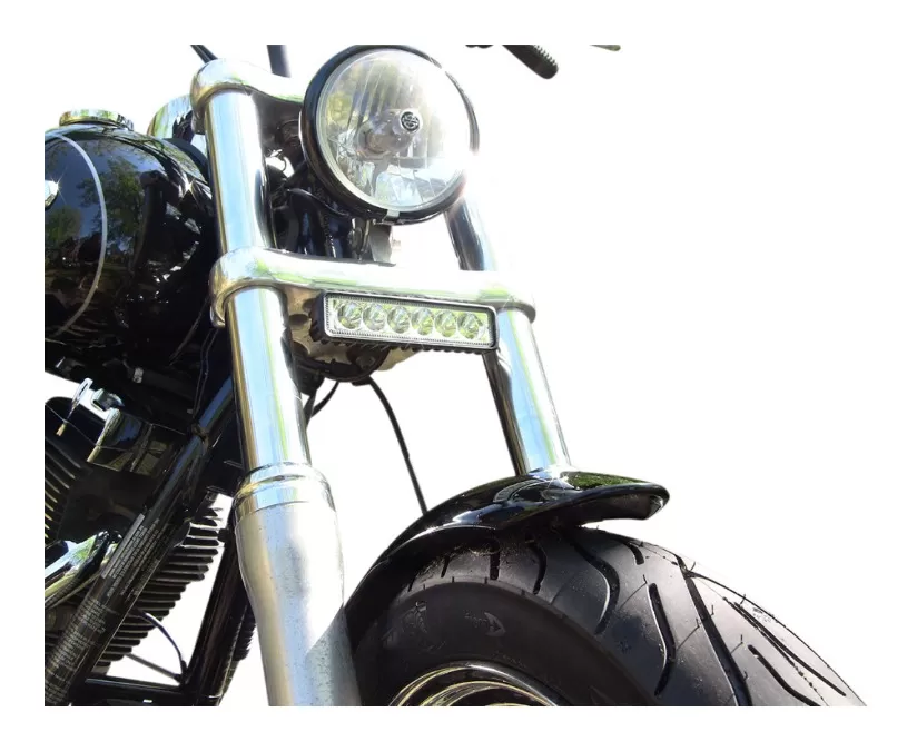 Aluminum light bar with 6 bright white, high power LEDs produce a super bright beam pattern to be used in addition to the headlamp. Mounting bracket included for securing to the triple tree using the factory headlamp mounting bolt.Â