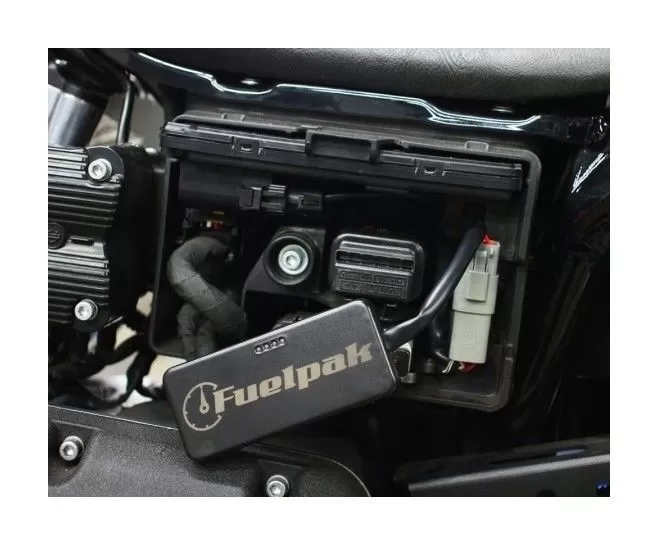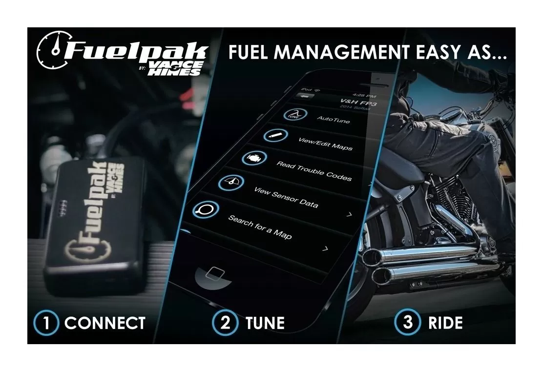 The Fuel Pack FP-3 is revolutionizing fuel management for Harley-Davidson J-1850 models. Connecting wirelessly by Bluetooth to any iPhone or Android smartphone, FP-3 makes it simple for a rider to recalibrate a host of engine parameters. Mapping for exhaust systems and other performance upgrades is available from the expansive library of calibrations being developed by Vance & Hines. FP-3 also boasts an Autotune feature that changes the air/fuel ratio many times a second, which means your bike actually gets better as you ride it! With the Fuelpak FP-3 module plugged-in, live sensor data can be viewed through your smartphone or tablet to display speed, RPM, power, torque, cylinder head temperature, voltage, and other vital information through the free V&H application’s user interface. Diagnostic Trouble Codes can also be read and cleared with the FP3.